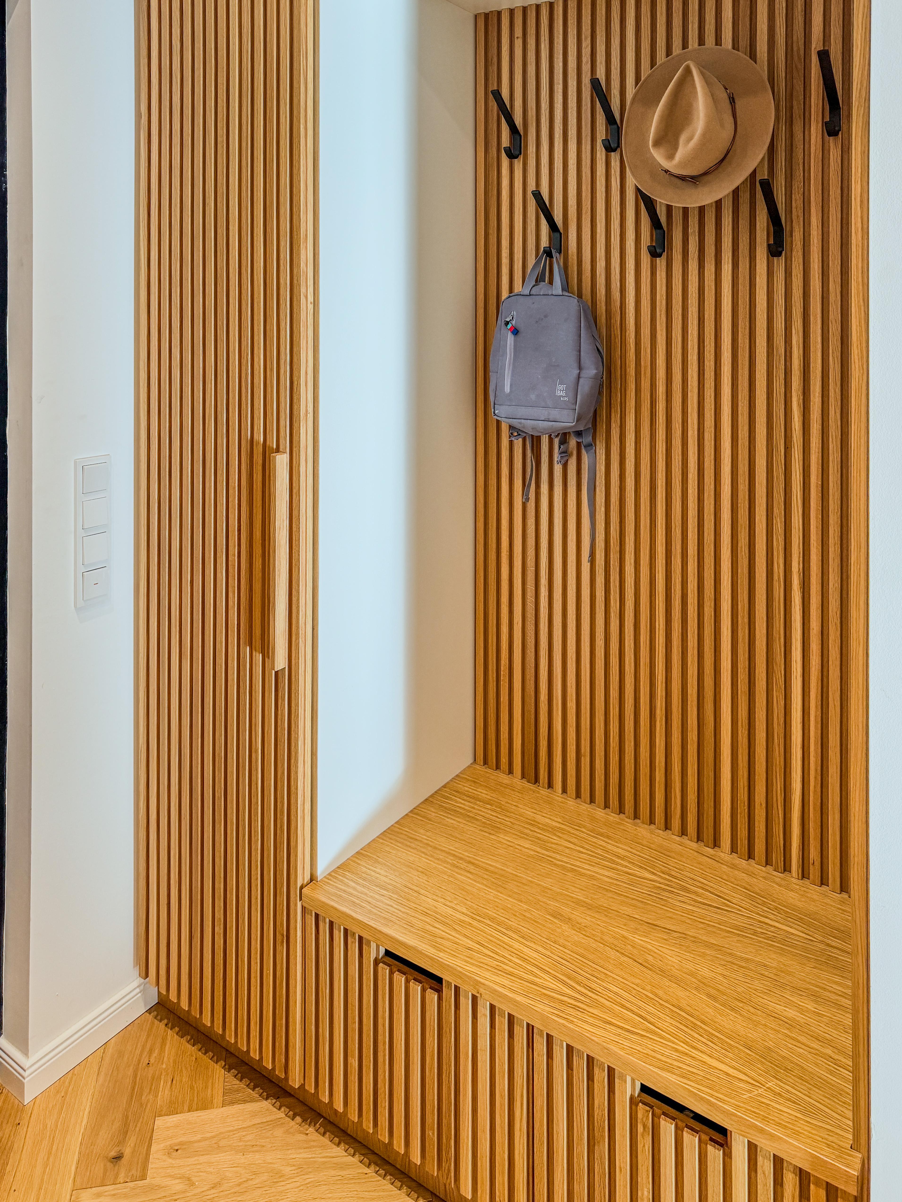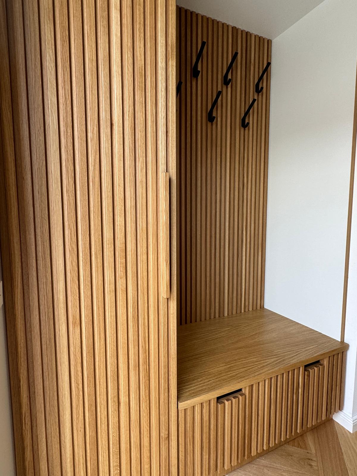 Garderobe aus Eichenholz mit Sitzbank und Hakenleiste.